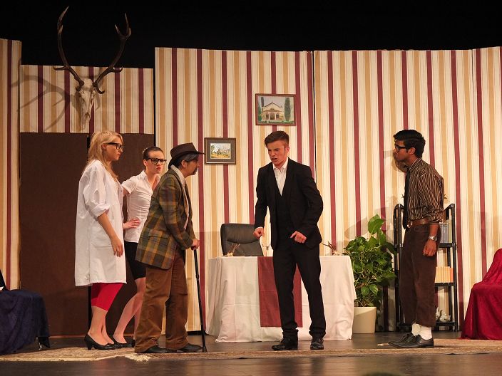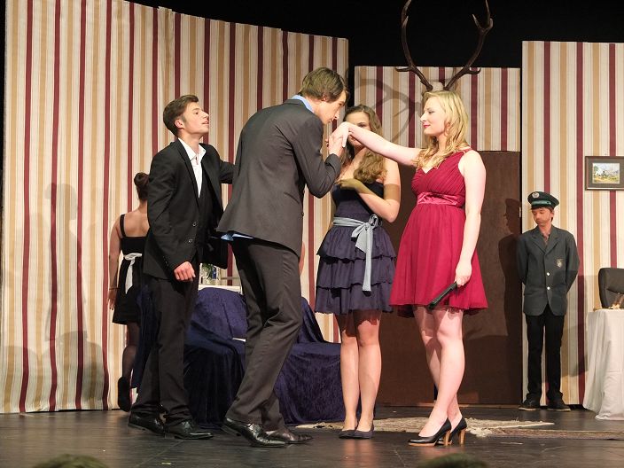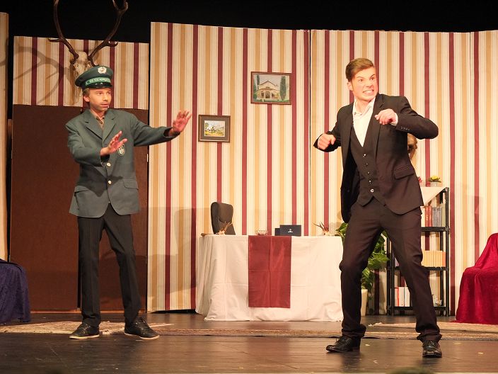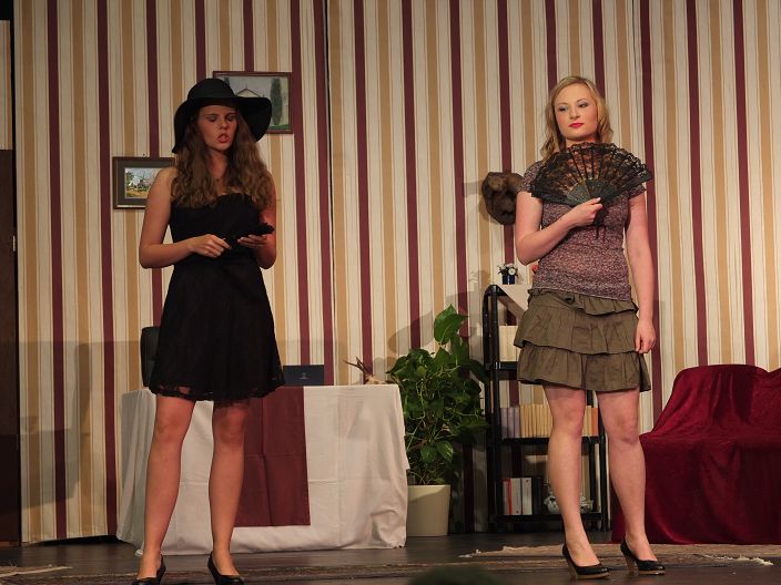 Und auch die holde Weiblichkeit findet einen solch hohen Beamten begehrenswert. Bei der Frau des Bürgermeisters (Christina Müller bzw. Carolin Burkhart) und deren Tochter (Luisa Ehrstein bzw. Anne Burkhart) ist er sogleich Hahn im Korb. Und der Hochstapler – wieder mal mit Wodka abgefüllt – schwingt sich sogar zum Schriftsteller auf. „Ich lebe nur für die Literatur“, prahlt er. Sogar „Der Mantel“ habe er geschrieben. Der Einwand, das Stück sei doch von Gogol, kontert er so: „Es gibt mehrere Mäntel.“ Besoffen steigt der Hochstapler auf einen Tisch, lallt und fällt herunter. Dennoch schwärmen die Damen: „So ein reizender Mann.“
