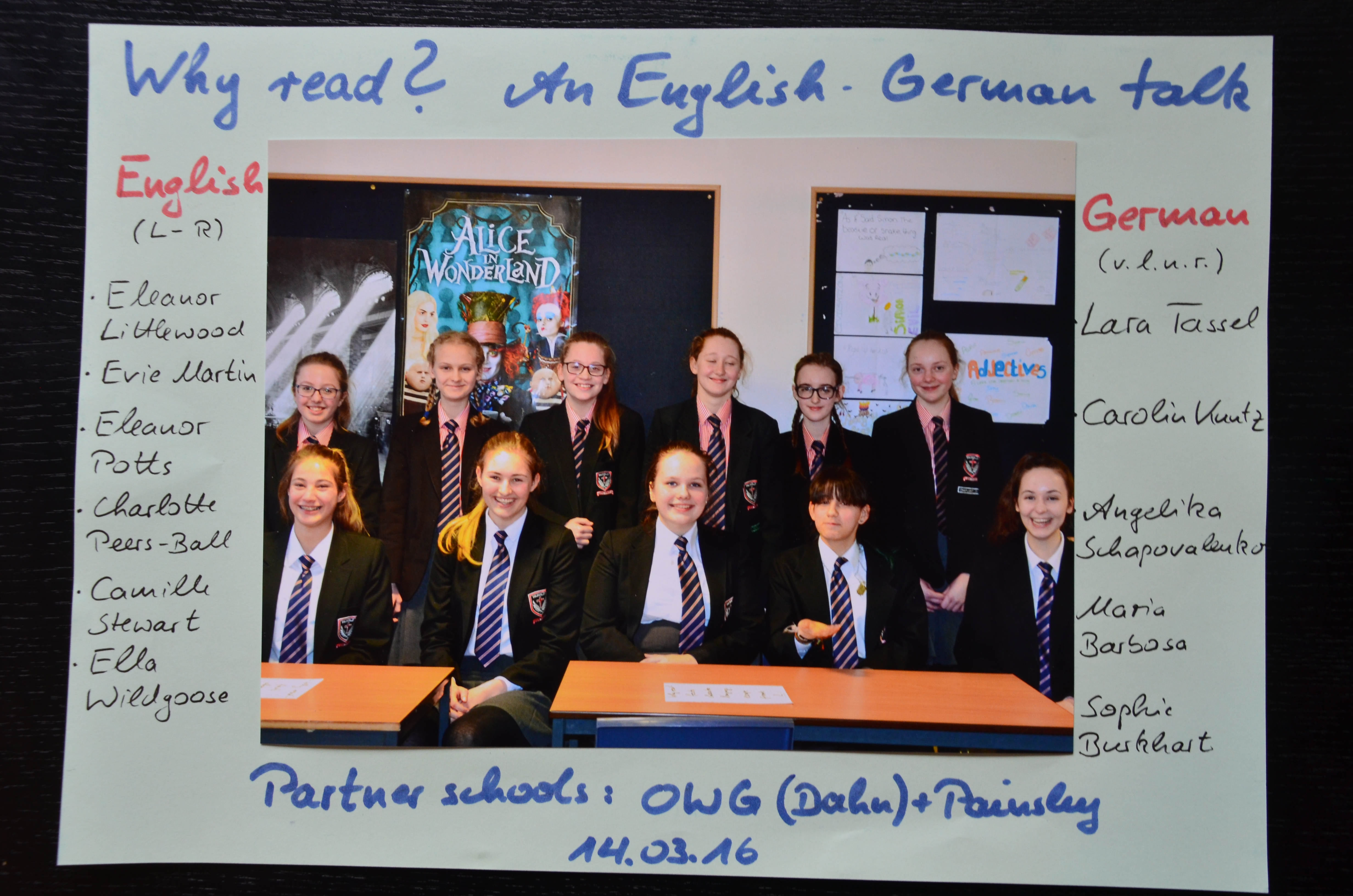 Eine Woche lang, vom 10. bis zum 17. März, waren zehn Schülerinnnen des Otfried-von-Weißenburg-Gymnasiums zu Besuch bei der Partnerschule Catholic Painsley Academy in England in der Nähe von Stoke-on-Trent (Staffordshire). Aufgeteilt war die Reisetruppe in zwei Gruppen: Den Schülerinnen des Projekts „Work Experience“ aus der 11. Jahrgangsstufe und den Schülerinnen des Projekts „Book Club“ aus der 8. bzw. aus der 9. Jahrgangsstufe.