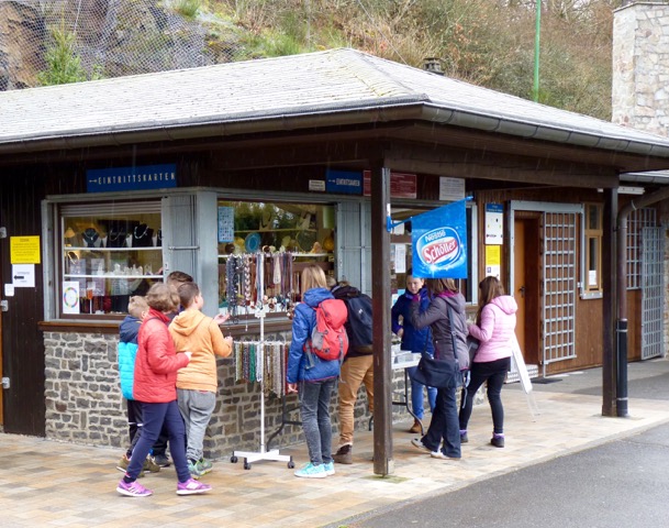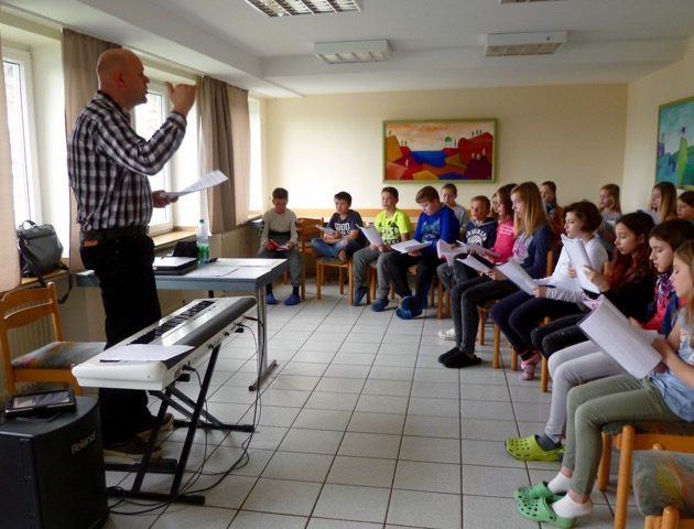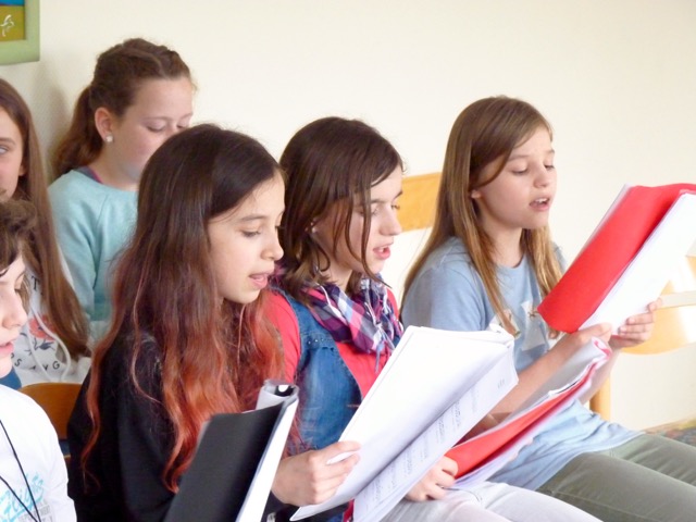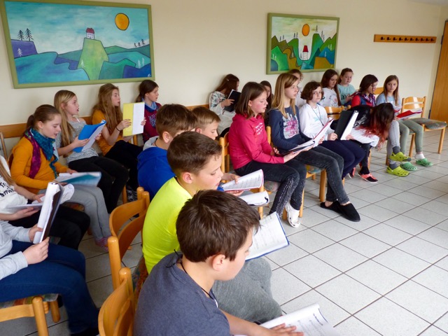 Doch die dortige Jugendherberge enttäuschte uns aber nicht, es gab gut ausgestattete Zimmer und einen Probenraum mit exklusiver Aussicht auf das Nahetal, auch das Essen war nicht schlecht. Gleich zu Beginn der drei Chorlager-Tage wurde der Stadtteil Oberstein erkundet und ein Blick auf die zahlreichen Schmuck- und Edelsteingeschäfte geworfen. Das Wetter meinte es weitgehend gut mit den Teilnehmern, gelegentlich ein wenig Regen vermochte die insgesamt gute Laune nicht zu trüben. Nachdem die Zimmer bezogen waren, konnte auch die recht anstrengende Probenarbeit beginnen – während sonst im Schuljahr nur montags eine knappe Unterrichtsstunde dafür zur Verfügung steht, mussten nun reichlich drei Stunden täglich durchgestanden werden. Zur Belohnung gab es nach dem Abendessen einmal eine recht spannende Nachwanderung (die Strecke war auch den Betreuern nicht wirklich bekannt) und am zweiten Abend einen Karaokewettbewerb, der von den Mitwirkenden (viel zu) ernst genommen wurde. Das war dann schon eine Ausgabe von „The Voice Kids“… Ein weiteres Highlight im Freizeitprogramm war der Besuch der Edelsteinmine im Steinkaulenberg. Weniger ein düsteres und enges Bergwerk, sondern vielmehr eine prächtig funkelnde und glitzernde Schauhöhle, konnte man sich von der Herkunft der inzwischen zahlreich gekauften Andenken, Ketten und Schmucksteine überzeugen. Als hätte ein findiger Bastler die Mineralien in den Fels der Mine eingeklebt, so vielfältig und umfangreich war das dort zu sehende Farbschauspiel. Am Mittwoch morgen stand leider schon wieder das Packen auf dem Programm, dennoch konnte in einer abschließenden Probe noch einmal gezeigt werden, welche großen Fortschritte der Orientierungsstufenchor in dieser ausführlichen und kompakten Probenzeit machen konnte. Es bleibt zu hoffen, dass die große Motivation für das gemeinsame Singen und Musizieren möglichst lange erhalten bleibt und vielleicht auch im nächsten Jahr wieder eine Chorfreizeit zustande kommen wird.